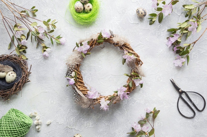 Весенний венок с цветами. Креативная плоская планировка. Вид сверху