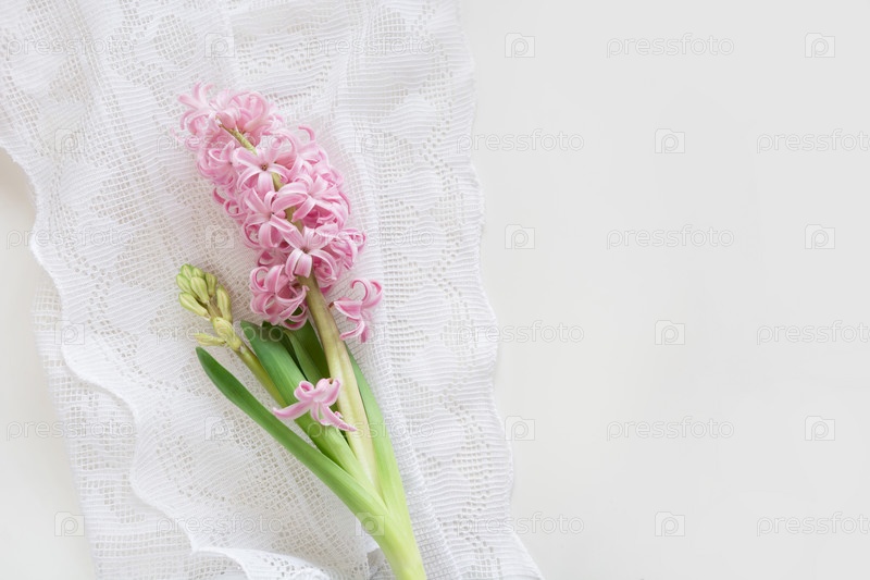 Весенняя концепция. Розовый гиацинт на белых шнурках на белом фоне. Вид сверху и пространство для копирования