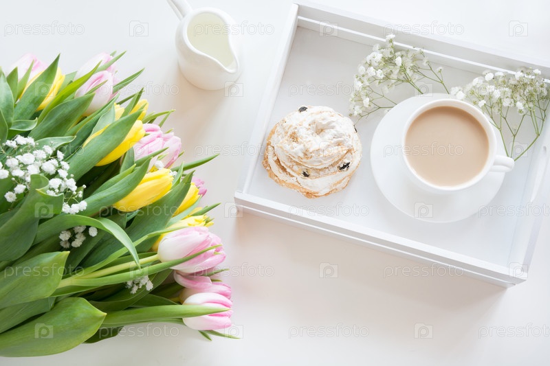 Утренний завтрак весной с чашкой черного кофе с молоком и выпечкой в пастельных тонах, букетом свежих желтых и розовых тюльпанов на белом. Вид сверху
