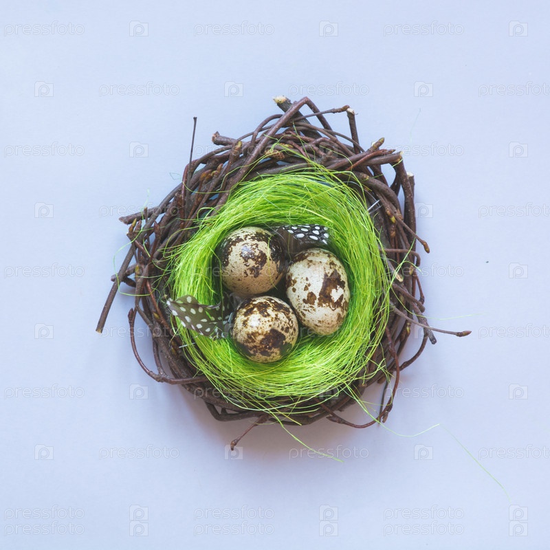 Пасхальный символ. Перепелиные яйца гнездятся на синем. Креативная плоская планировка. Вид сверху