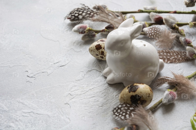Пасхальный кролик и весенняя ива на столе. Место для текста