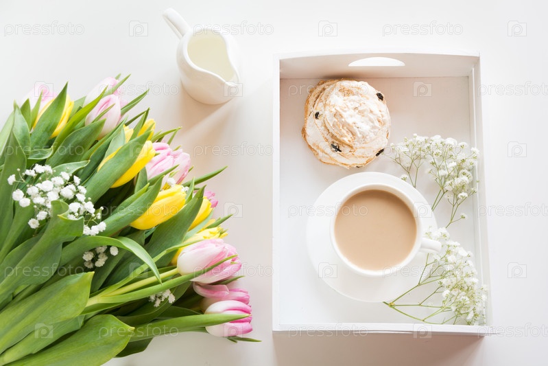 Утренний завтрак весной с чашкой черного кофе с молоком и выпечкой в пастельных тонах, букетом свежих желтых и розовых тюльпанов на белом фоне. Вид сверху