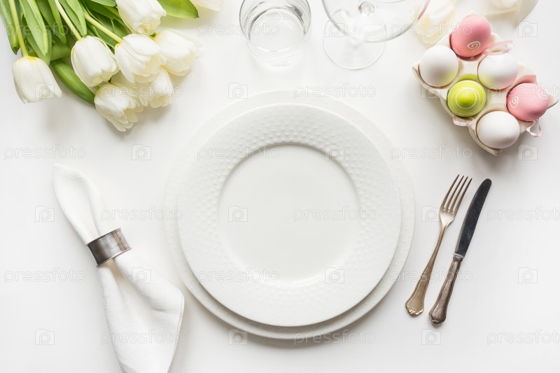 Сервировка пасхального стола с белыми тюльпанами, яйца на белом столе. Вид сверху