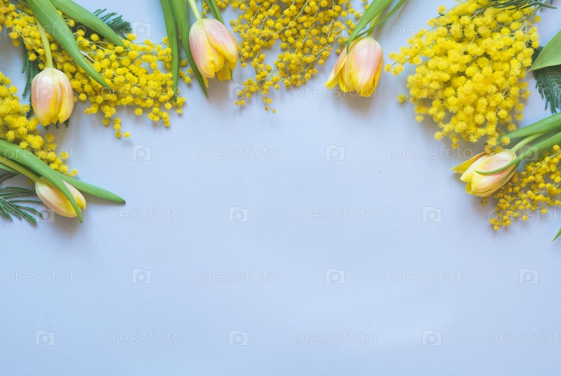 Весенняя цветочная кайма из желтых тюльпанов, мимозы на синем. Вид сверху с копией пространства