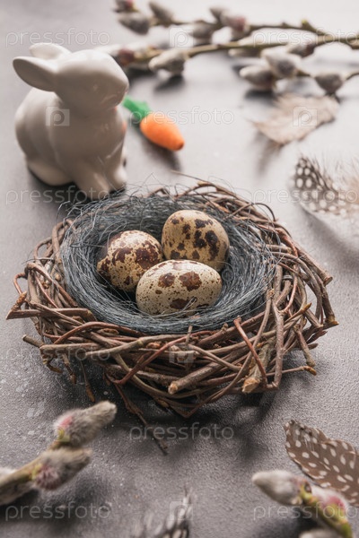 Пасхальные яйца перепелов в гнезде, кролике и весенней иве на винтажном столе