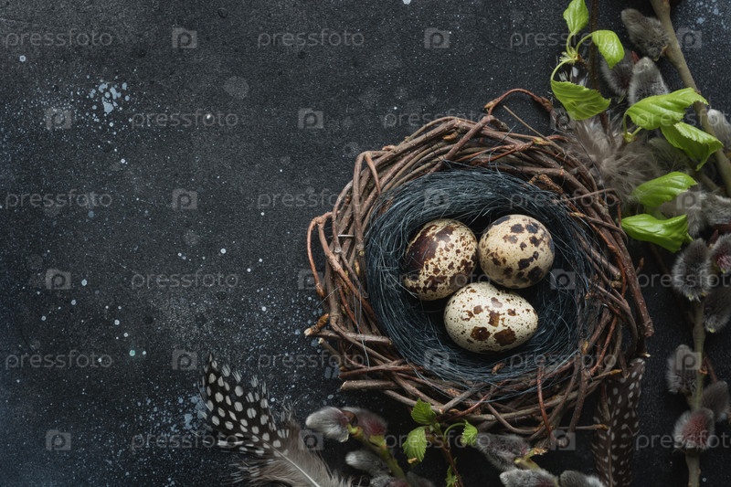 Перепелиные яйца в гнезде, весенняя ива на темном столе. Место для текста. Пасхальная композиция