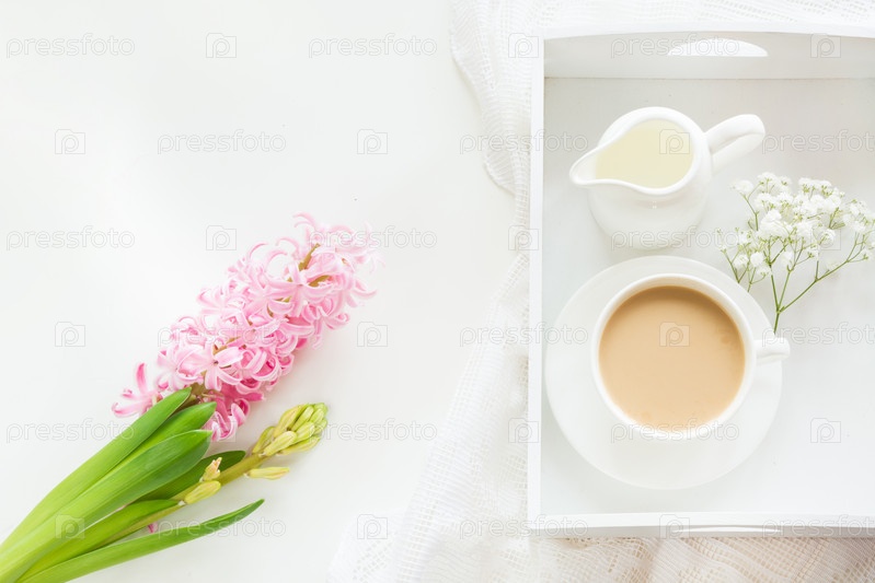Утренний завтрак весной с чашкой черного кофе с молоком в пастельных тонах, букетом свежего розового гиацинта на белом фоне. Вид сверху и пространство для копирования