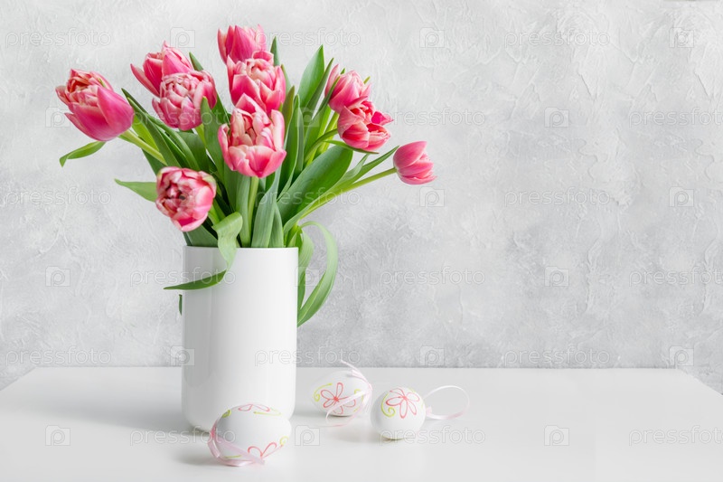 Букет красного тюльпана в вазе на белом винтажном столе