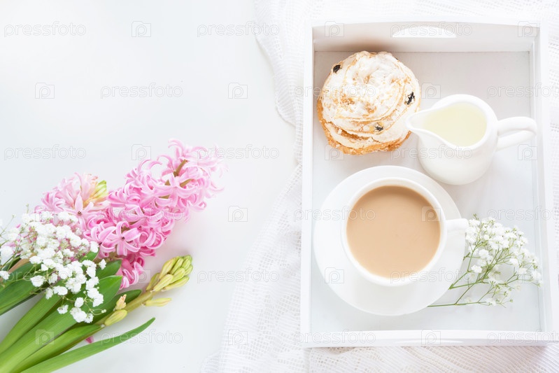 Утренний романтический завтрак, чашка кофе, молочный кувшин и торт с декором из розового гиацинта. Весенняя концепция. Вид сверху