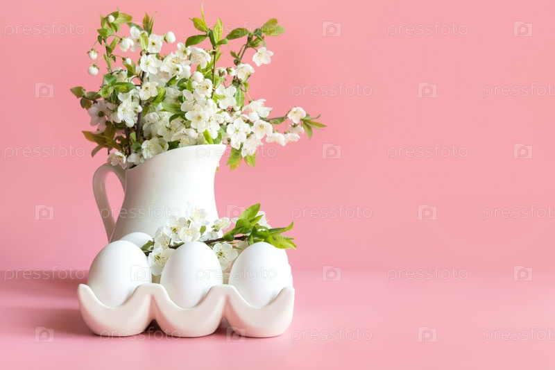 Букет весенних цветов в вазе и яйца на розовом столе. Место для текста