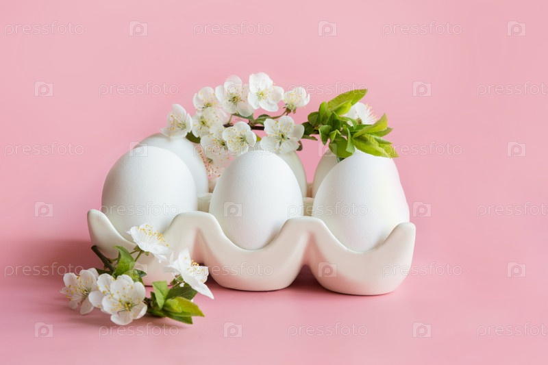 Органические куриные яйца с цветами в фарфоровой коробке. Пасхальный. Весна. Закрыть