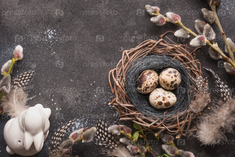 Пасхальные яйца перепелов в гнезде, кролике и весенней иве на винтажном столе