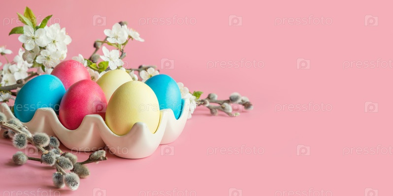 Красочные яйца с весенними цветами на розовом. Пасхальный. Закрыть