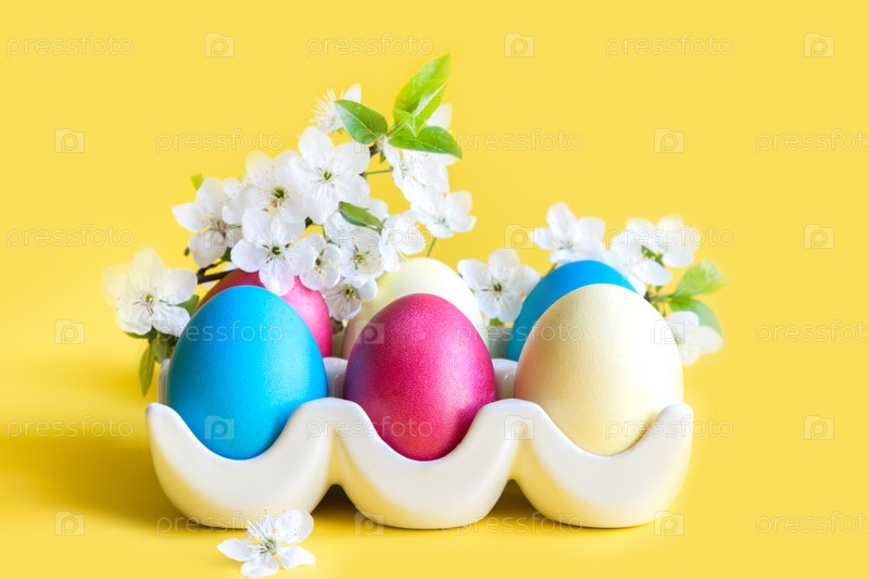 Красочные яйца с весенними цветами на желтом. Пасхальный. Весна. Закрыть