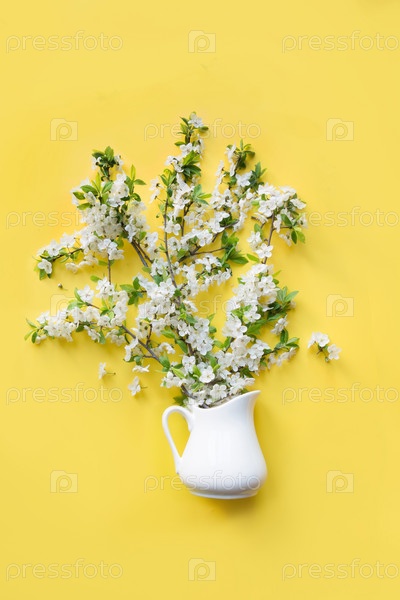 Букет белых цветов цветущего вишневого фруктового дерева в вазе на желтом. Вид сверху. Плоская укладка