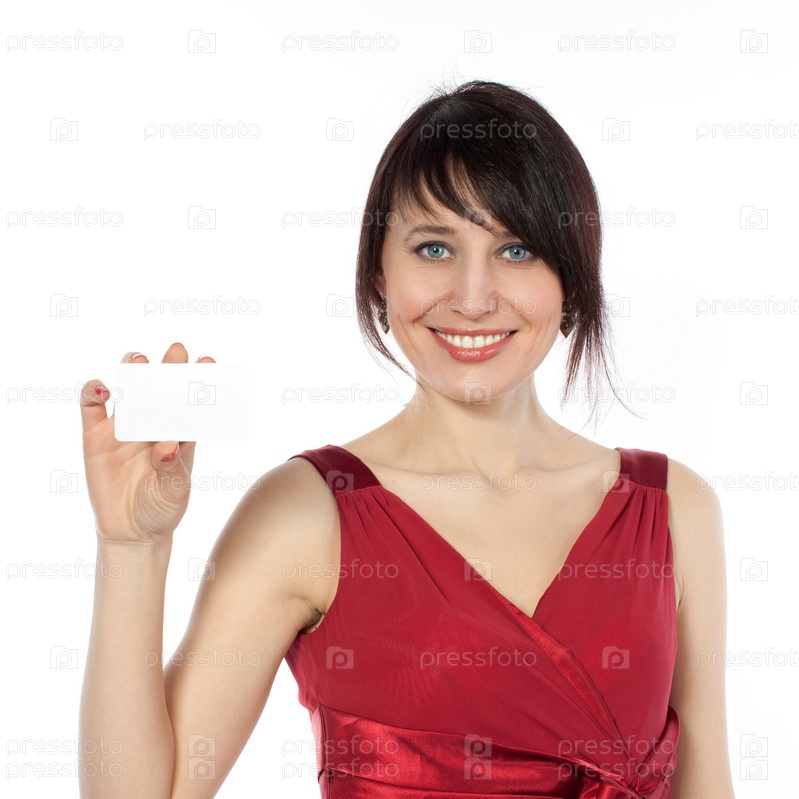 Счастливая европейская женщина с пустой визитной карточкой