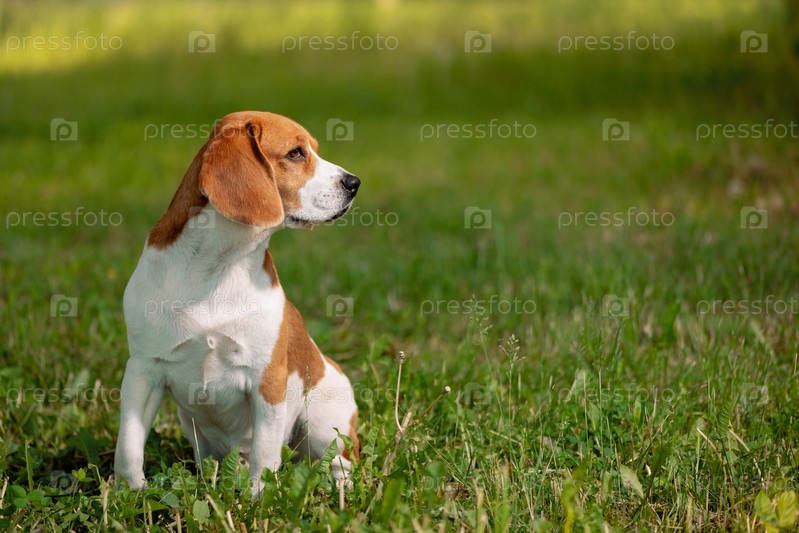 Бигль сидит на траве и смотрит в сторону