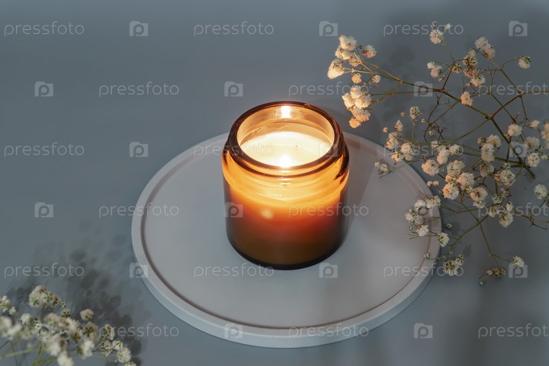 Горящая свеча ручной работы из парафина и соевого воска в стеклянной банке на бетонном подносе. Изготовление ароматических свечей. Роскошное украшение, домашний декор с горящей ароматной свечой с белым сухим цветком