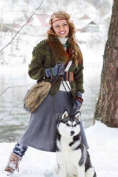 Счастливая молодая женщина стоит с сибирским хаски
