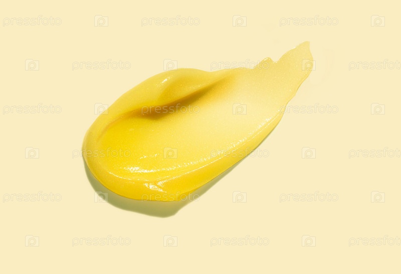 Косметическая банановая желтая текстура. Гелевое пятно на бежевом фоне