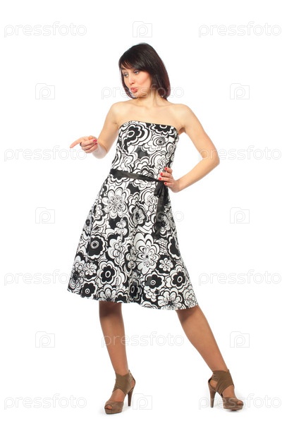 Женщина показывает рукой на белый фон