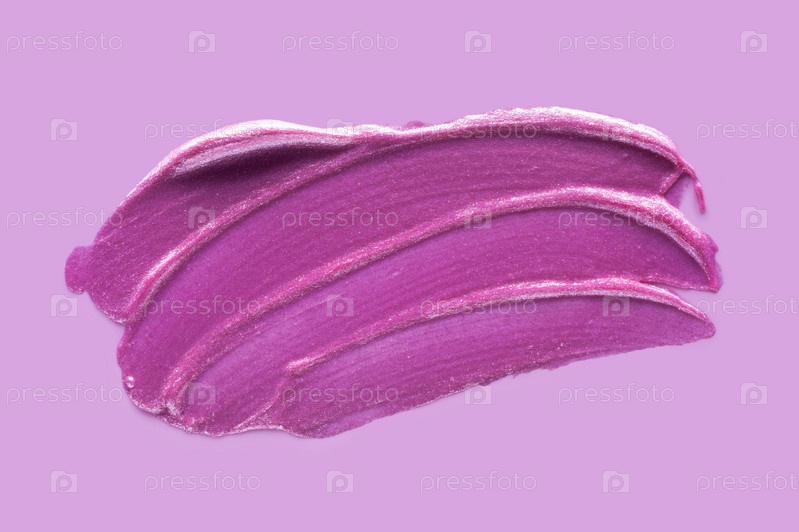 Блеск для губ розово-фиолетового цвета, образец пятна, выделенный на фиолетово-сиреневом фоне