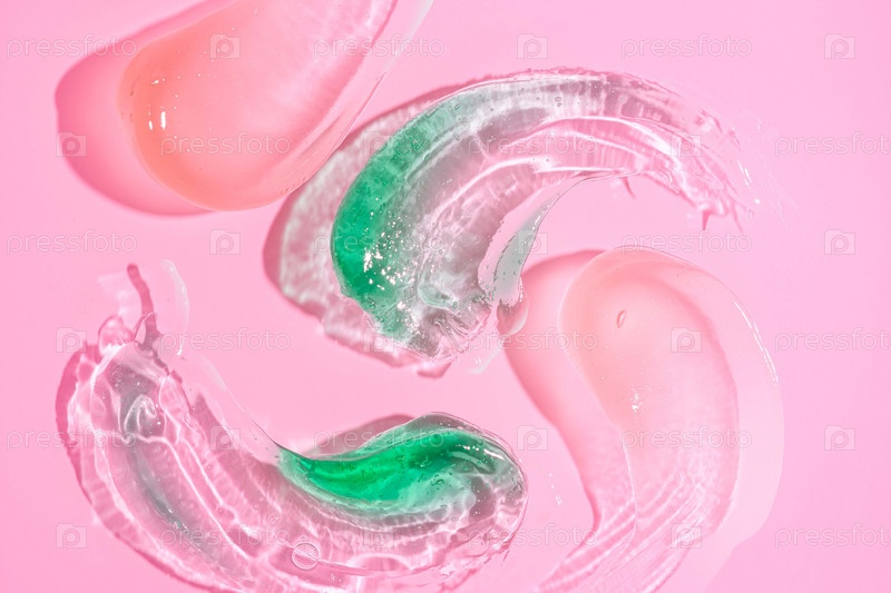 Косметическая зеленая и розовая текстура. Гелевое пятно на розовом фоне