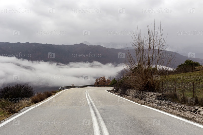 Сельская дорога в горах зимой (регион Эпира, Греция) в пасмурный, туманный день