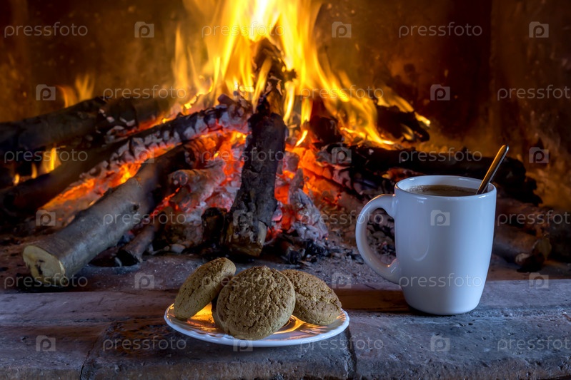 Национальное, рождественское греческое печенье "меломакарона" и чашка кофе на фоне камина