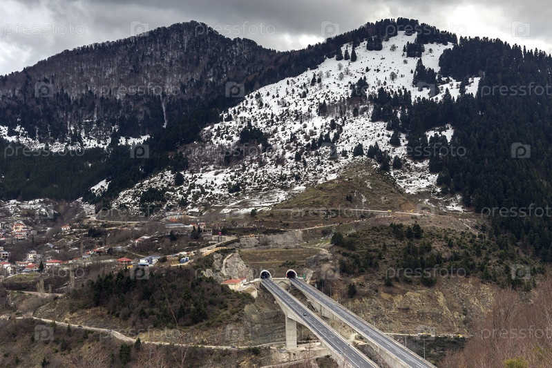 Зима в горах (район Эпира, Греция) и проселочная дорога в зимний день