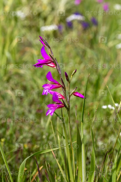 Дикий гладиолус (Gladiolus communis) растет на лугу в солнечный весенний день