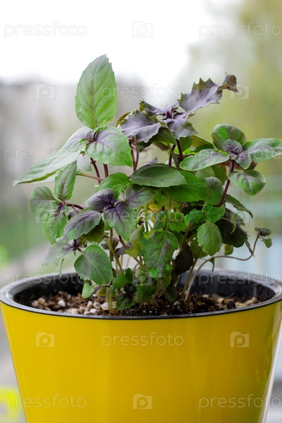 Базилик в желтом горшке на подоконнике застекленного балкона. Выращивание ароматных трав в домашних условиях