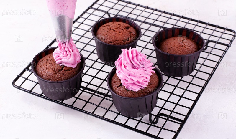Покрыть шоколадные капкейки взбитым ягодным кремом из кондитерского мешка на решетке для охлаждения. Приготовление десерта