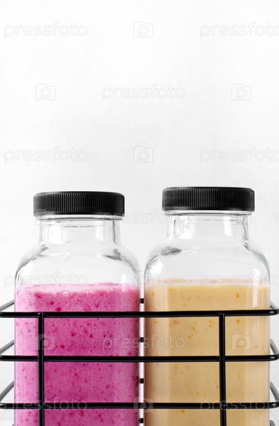 Смузи с ягодами и фруктами в двух стеклянных бутылках в проволочной корзине на белом фоне. Здоровое разнообразие напитков и детское питание