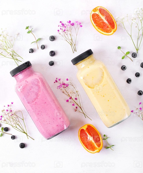 Смузи с ягодами и фруктами в двух стеклянных бутылках на белом столе. Здоровая вариация напитков и детское питание. Плоская планировка