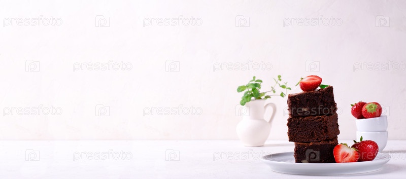 Веб-баннер с кусочками шоколадного пирожного с орехами и клубникой на белом столе. Домашний десерт. Макет с копией пространства