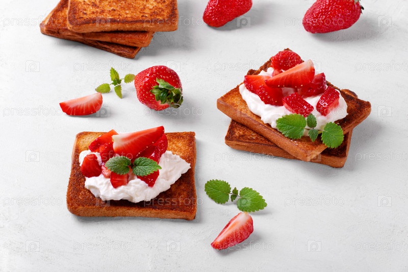 Брускетта с клубникой и сыром страчателла на белом столе. Изысканная закуска