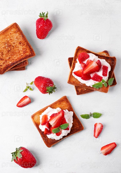 Брускетта с клубникой и сыром страчателла на белом столе. Изысканная закуска. Вид сверху