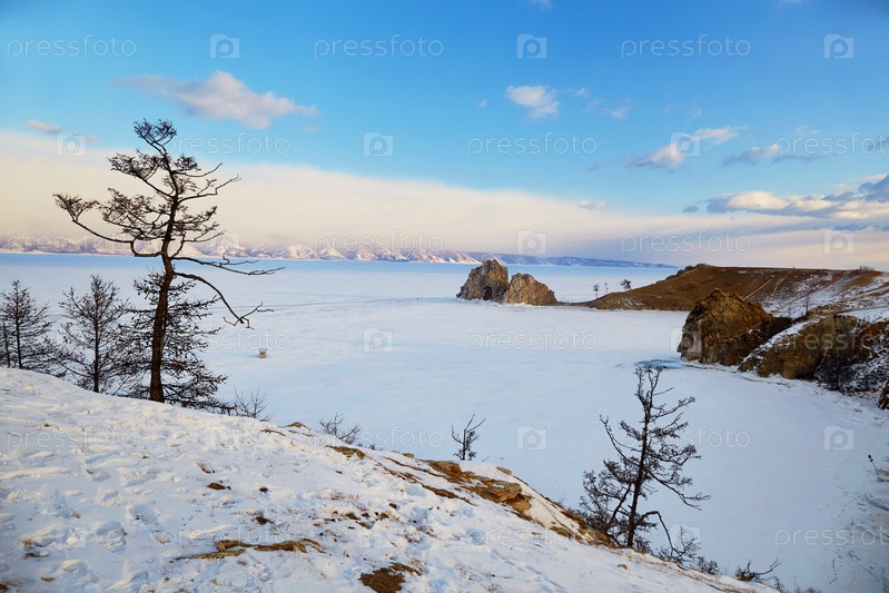 Вид на мыс Бурхан или скалу Шаманка на острове Ольхон зимой. Замерзшее озеро Байкал