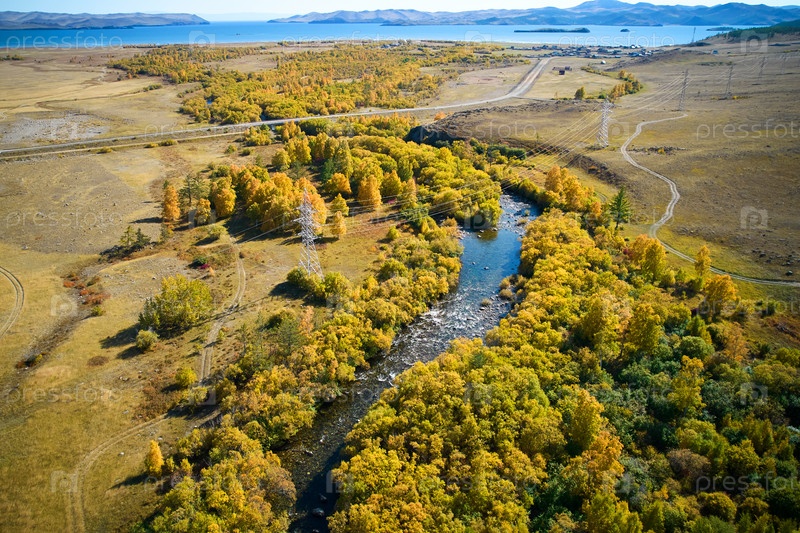 Осенний пейзаж с воздуха. Желтые деревья на берегу реки. Река Сарма, озеро Байкал