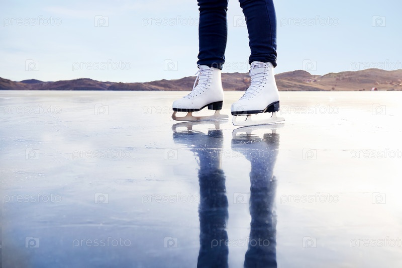 Женские ноги в белых коньках на открытом катке на закате. Девушка катается по замерзшему озеру Байкал
