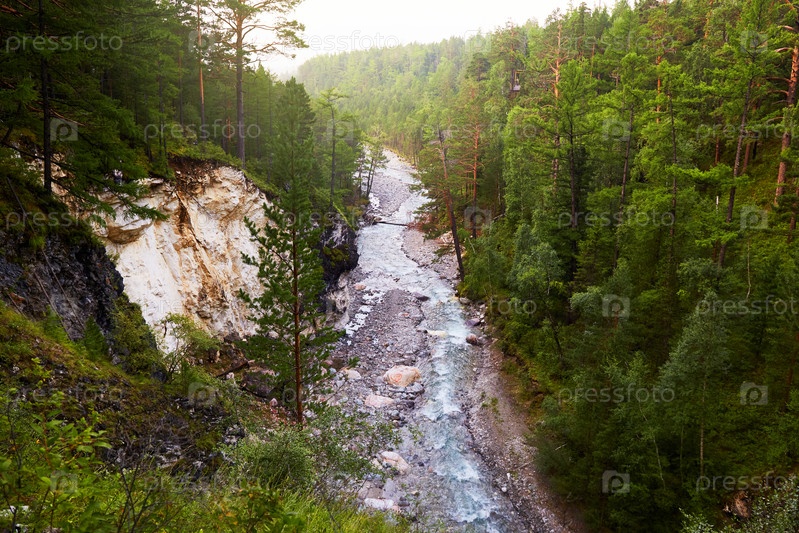Река, протекающая между горами, покрытыми лесом