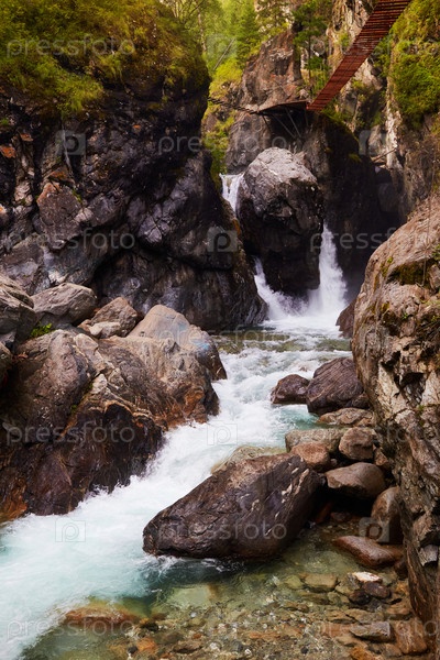 Водопад на горной реке. На вершине есть подвесной мост для туристов. Экстремальный отдых на природе