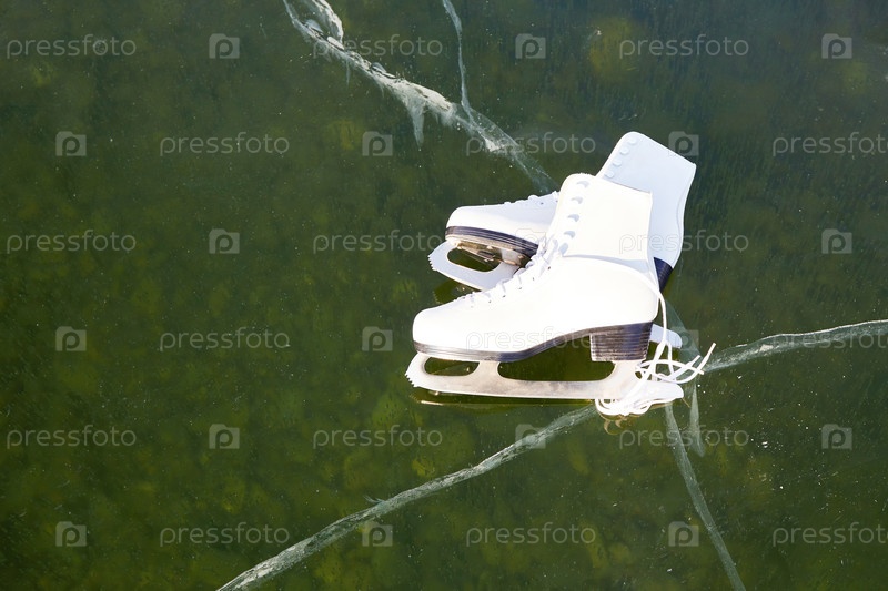 Белые женские коньки для фигурного катания на льду озера. Естественный фон, прозрачный лед