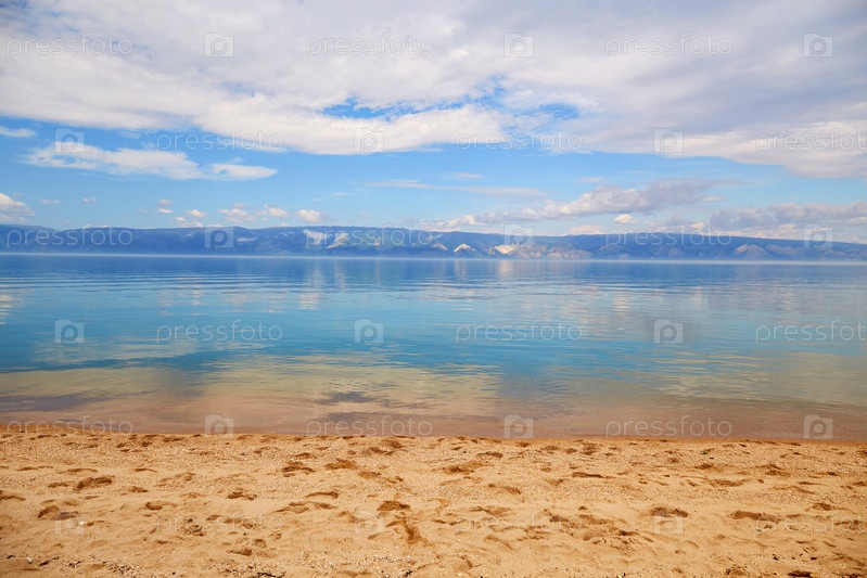 Красивый летний фон. Песчаный пляж, голубая вода, горы на заднем плане, облачное небо. озеро Байкал