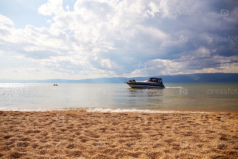 Яхта с туристами в красивой бухте на Байкале. Облачное небо, песчаный пляж с мелкой галькой