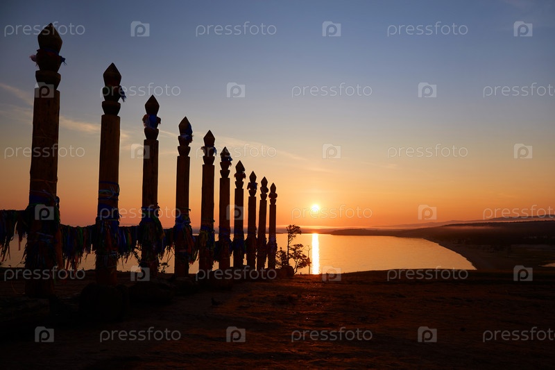 Красочный восход солнца над Сарайским заливом озера Байкал. Ритуальные шаманские шесты из саржи на острове Ольхон