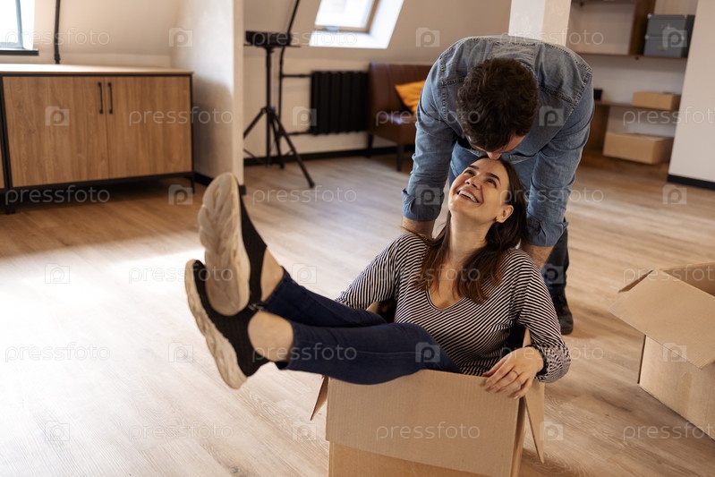 Счастливая пара брюнеток развлекается и катается на картонных коробках в новом доме