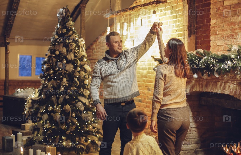 Счастливые семейные родители с двумя детьми танцуют вместе возле камина и рождественской елки в уютном загородном доме, украшенном к рождественским праздникам. Мать, отец и дети празднуют Новый год в фермерском доме