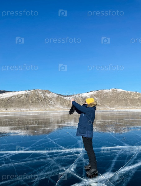 Мужчина-путешественник общается в смартфоне вокруг таинственного красивого льда Байкала